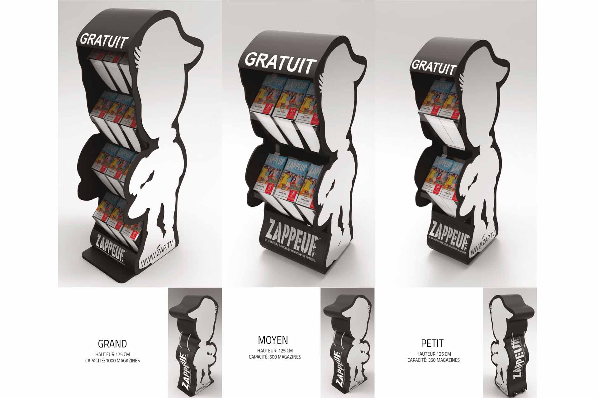 Les points de dépôts ont des trafic visiteurs variables. Pour en tenir compte, nos présentoirs sont disponibles en 3 tailles: grand, moyen, petit. Ils sont en métal et protégés. Il existe également un 4e présentoir spécifiquement dédié aux comptoirs de magasins.